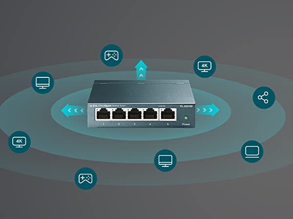 Tăng cường tốc độ mạng của bạn với Switch Để bàn 5 cổng Gigabit TL-SG105. Không chặn, 5 cổng 10/100/1000Mbps cho phép truyền các tập tin lớn mà không bị nhiễu.