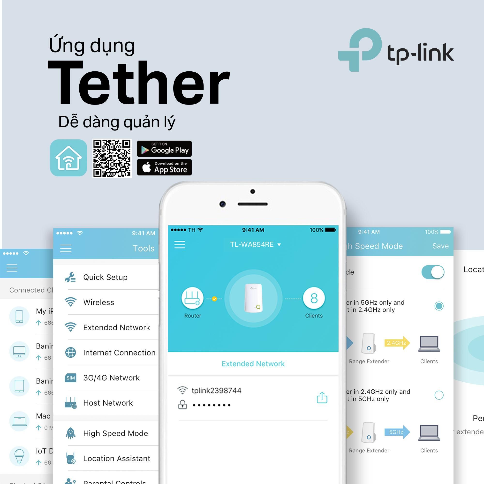 Sản phẩm tích hợp cổng Ethernet trên TP Link TL-WA855RE cho phép thiết bị hoạt động như một bộ chuyển đổi không dâyđể kết nối các thiết bị có dây như máy nghe nhạc Blu-ray ®, chơi game console, DVR và TV Internet. Đồng thời, tại cùng thời điểm thiết bị có thể chia sẻ mạng không dây.